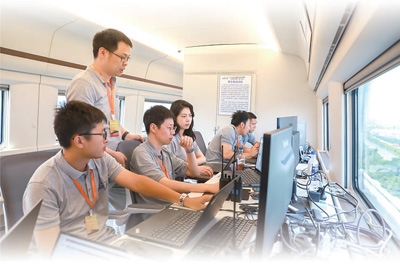 CR450青年團隊成員在試驗列車上研討技術(shù)細節(jié)。