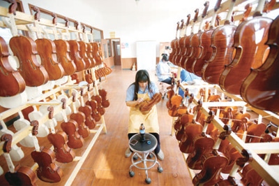 2000年左右,東高村鎮(zhèn)借助提琴產(chǎn)業(yè)和人力資源優(yōu)勢(shì),將初期的小作坊模式逐步發(fā)展為集群樂(lè)器企業(yè)模式,把提琴產(chǎn)業(yè)這把“火”燒得越來(lái)越旺。到2008年,世界上每10把小提琴,便有3把來(lái)自這個(gè)小鎮(zhèn)。每年生產(chǎn)的近30萬(wàn)把提琴,通過(guò)集裝箱,漂洋過(guò)海,銷往全球40多個(gè)國(guó)家和地區(qū)。