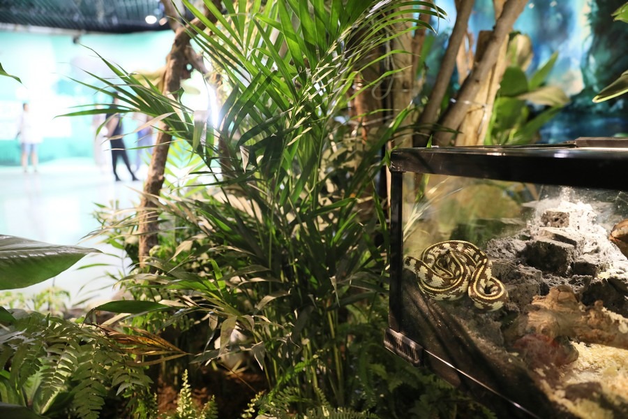 此次展覽主要以實(shí)景植物造景、活體動(dòng)物和圖文展板相結(jié)合的方式進(jìn)行展示。其中活體動(dòng)物有30多種約300只,包括鸚鵡、守宮、蛇、蜥蜴等鳥類和爬行類動(dòng)物。