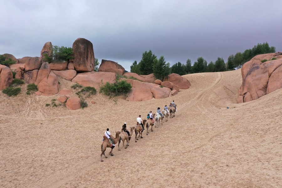 7月31日,雨后的玉龍沙湖空氣清新,游客在玉龍沙湖景區(qū)越野穿沙、騎駱駝?dòng)瓮妫蕾p沙海奇觀。