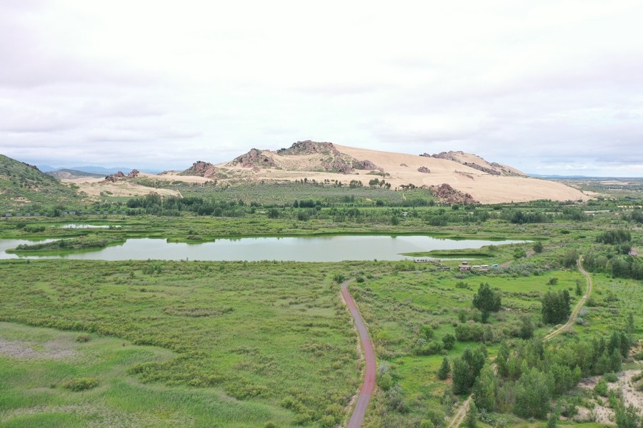 玉龍沙湖位于內(nèi)蒙古赤峰市翁牛特旗,這里集沙漠、怪石、古樹、奇峰、草原、湖泊、濕地等于一身,5萬畝草原與茫茫的科爾沁沙地相連,綠洲掩映,湖光山色,形成沙海相連的奇特景觀。