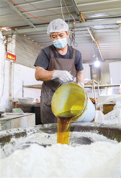 “我們堅持手工制作,就是想留住這個味道!”常三文是隆盛莊月餅制作技藝非遺傳承人,他帶記者來到了打月餅的作坊。一個約60平方米的房間里有兩個大鐵鍋,一個鐵鍋里熬著糖水,另一個鐵鍋用來和面。一名男工將面粉、熟胡麻油、糖水等按比例倒入鐵鍋,然后用鐵鏟攪拌起來。鐵鍋旁邊是一個做月餅的大案板,4個女工稱重、分劑、做胚、擺放,各自忙活著。常三文的兒子常曉峰負(fù)責(zé)將擺放好的月餅放進(jìn)燒爐火的烤爐,計時、下簽子、刷油……直至月餅烤制完成出爐。
