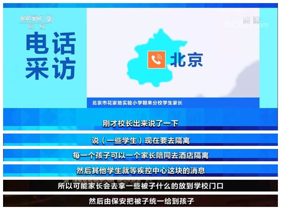 北京市花家地實(shí)驗(yàn)小學(xué)朝來分校 學(xué)生家長:現(xiàn)在應(yīng)該是做完核酸檢測,在等結(jié)果了。老師在群里面會(huì)通知我們,孩子可能明天開始線上上課。