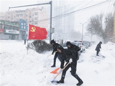 由雪花組成的白色天幕中,“迷彩服”一閃而過(guò)的綠色迸發(fā)出濃濃的生機(jī)。這些人手拿鐵鍬、掃把等工具一邊鏟雪清掃道路,一邊提醒過(guò)路行人:“小心路滑,注意安全。”溫暖的話語(yǔ)感染了兩邊的商戶,大家也紛紛加入到了“迷彩”防線,投入除雪運(yùn)動(dòng)中。