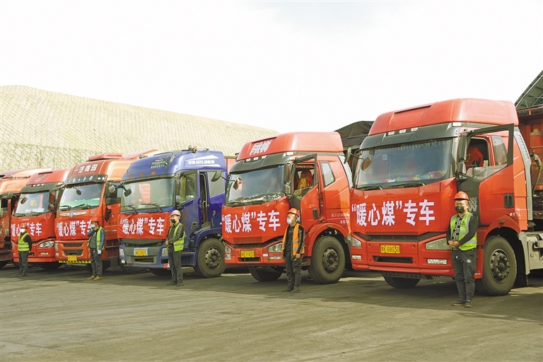 10月24日,一輛輛掛著大紅綢、載著“暖心煤”的運煤大卡車排成一列,從鄂爾多斯達(dá)拉特旗杭蓋溝煤礦整裝待發(fā),即將發(fā)往位于吉格斯太鎮(zhèn)的榮通煤炭物流園區(qū),那里是該鎮(zhèn)“暖心煤”的發(fā)放點。