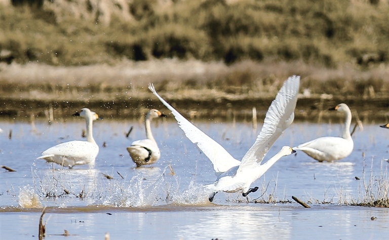 托克托縣黃河濕地管護中心副主任王曉東接受記者采訪時表示,黃河流經(jīng)托克托縣37.5公里、9個自然村。隨著近年來對黃河流域生態(tài)環(huán)境保護力度的加大,每年都會吸引大批鳥類來托克托縣“做客”,其中尤以天鵝最受關注。天鵝屬于國家二級保護鳥類,每年從2月底3月初開始,就會成群結隊來黃河流域一帶停歇、棲息、覓食,補充能量后,再繼續(xù)飛行,最多的時候有上萬只。(記者 張巧珍 牛天甲)