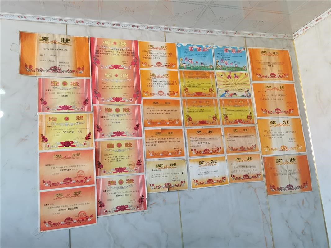 喜玉的家,陳設(shè)簡單,干凈利落。引人注目的是家里的一面墻壁,張貼著數(shù)十張獎狀。