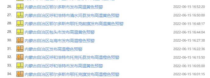 據(jù)內(nèi)蒙古氣象臺預(yù)計,6月16~20日連續(xù)5天,內(nèi)蒙古西部及中部偏西大部地區(qū)(阿拉善盟、烏海市、巴彥淖爾市、鄂爾多斯市、包頭市、呼和浩特市等大部地區(qū))將迎來今年首次大范圍35℃以上高溫天氣,其中,西部部分地區(qū)最高氣溫將達37℃及以上,局地超過40℃;20~21日阿拉善盟高溫將逐漸減弱消失,而35℃以上高溫天氣向錫林郭勒盟西部延伸。