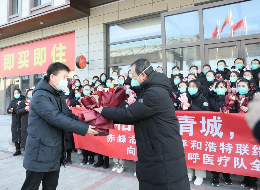 新華融媒、北疆新聞網(wǎng)消息(記者 張楊)“自呼和浩特疫情發(fā)生以來,50多個晝夜,白衣天使們逆行參戰(zhàn),奮戰(zhàn)在抗疫第一線,為呼和浩特保衛(wèi)戰(zhàn)貢獻了自己的力量,體現(xiàn)了白衣天使的責任和擔當,更展現(xiàn)了赤峰人奮勇拼搏的精神,圓滿完成了援呼醫(yī)療各項任務,沒有辜負家鄉(xiāng)人民的重托,大家辛苦啦!”12月5日,在赤峰援呼普通病區(qū)醫(yī)療隊圓滿完成各項任務,即將凱旋之際,赤峰市人民政府駐呼和浩特聯(lián)絡(luò)處和內(nèi)蒙古赤峰商會,共同到醫(yī)療隊駐地看望醫(yī)療隊員。赤峰市人民政府駐呼和浩特聯(lián)絡(luò)處副主任李子輝,代表駐呼聯(lián)絡(luò)處和內(nèi)蒙古赤峰商會在呼和浩特地區(qū)鄉(xiāng)友,向援呼醫(yī)療隊領(lǐng)隊羅俊祥等醫(yī)護人員獻上鮮花和對家鄉(xiāng)同胞的親切問候。
