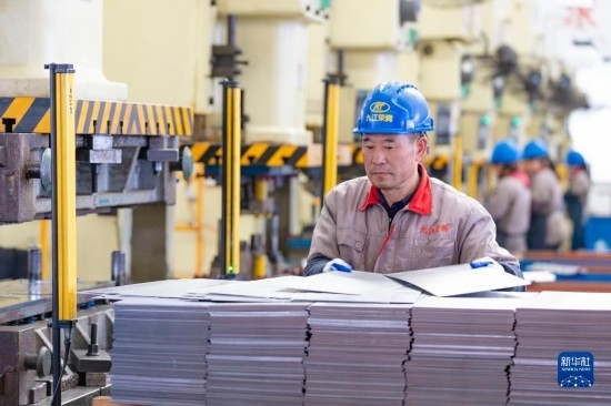2月15日,在山東省濱州市博興縣店子鎮(zhèn)一家廚具生產(chǎn)企業(yè)車間內(nèi),工人在生產(chǎn)線上加工廚具。