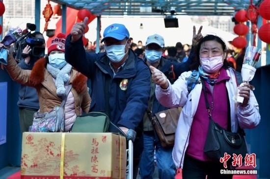 2月19日,搭載59名旅客的“吉順9號(hào)”客輪緩緩駛?cè)敫V葸B江黃岐客運(yùn)碼頭,標(biāo)志著連江黃岐至馬祖白沙“小三通”客運(yùn)航線復(fù)航。此前,廈門-金門客運(yùn)航線、福州馬尾-馬祖客運(yùn)航線、泉州-金門客運(yùn)航線已相繼復(fù)航。圖為兩岸鄉(xiāng)親在黃岐客運(yùn)碼頭激動(dòng)相擁。中新社記者 張斌 攝
