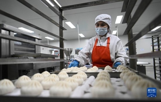 天津利達(dá)糧油有限公司速凍面食生產(chǎn)車間,工作人員在搬運速凍包子(2月23日攝)。