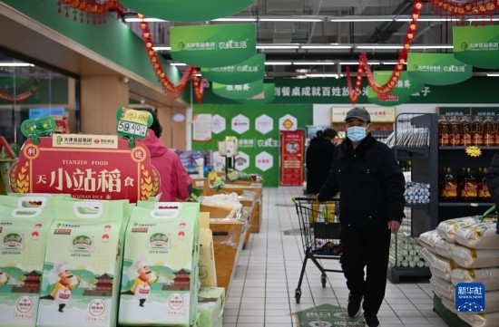 顧客在天津食品集團(tuán)津農(nóng)精品體驗店選購產(chǎn)品(2月23日攝)。