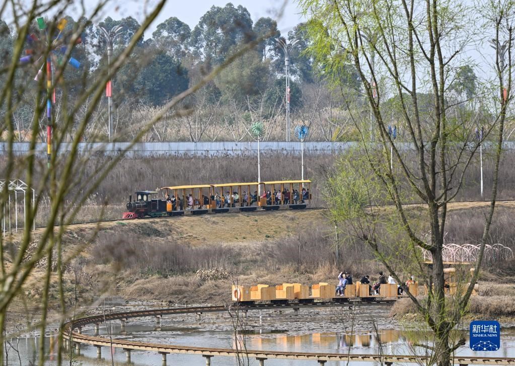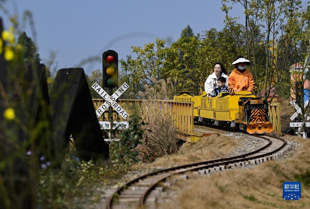 2月25日,游客在四川眉山市仁壽縣中鐵火車來斯休閑體驗園乘坐小火車游玩。