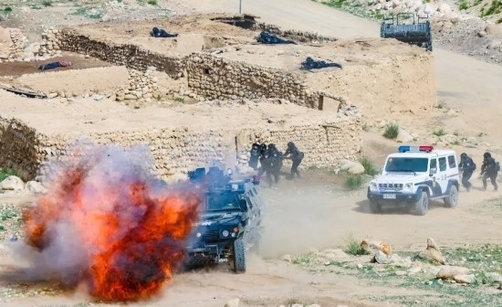 新疆邊檢總站喀什邊境管理支隊開展實戰(zhàn)模擬演練。圖為該支隊移民管理警察步甲協(xié)同,圍捕藏匿在房屋內(nèi)的不法分子。