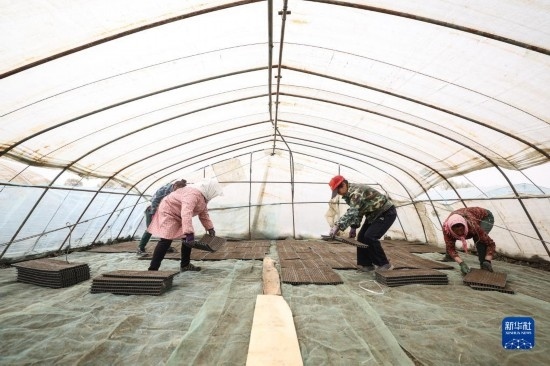 4月14日,盤(pán)錦市盤(pán)山縣的農(nóng)戶在進(jìn)行水稻秧苗育苗工作。