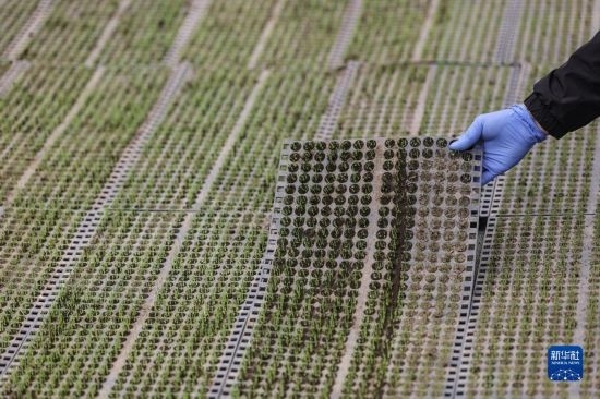 4月14日,盤(pán)錦市盤(pán)山縣的農(nóng)戶在查看水稻秧苗的育苗情況。