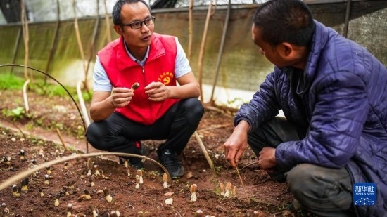 4月14日,農(nóng)技工作者在六盤水市鐘山區(qū)汪家寨鎮(zhèn)那羅村查看皺環(huán)球蓋菇的種植情況。