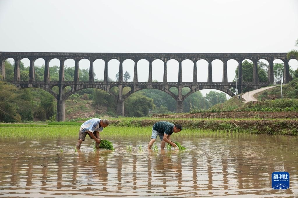 4月25日,在瀘縣奇峰鎮(zhèn)寶豐村,村民在寶藏渡槽附近的水田里插秧。