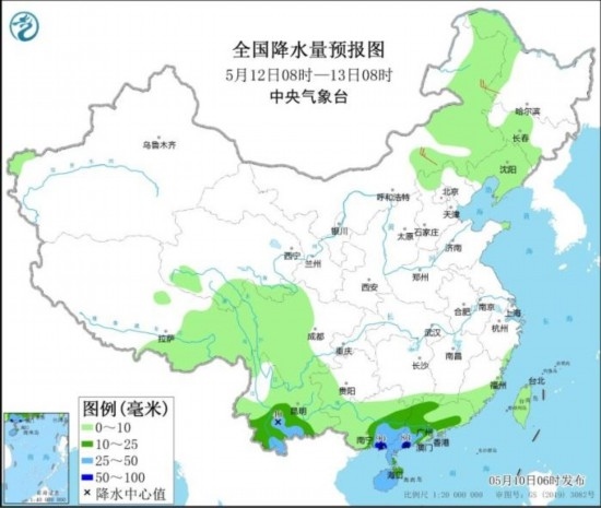 5月12日08時至13日08時,西藏東部、青海南部等地部分地區(qū)有小到中雪或雨夾雪;云南中南部、廣西東南部、廣東中西部和海南島等地部分地區(qū)有中到大雨,其中,廣西東南部沿海、廣東西南部等地局地有暴雨(50~90毫米)。內(nèi)蒙古中東部、東北地區(qū)中西部等地部分地區(qū)有4~5級風(fēng)。