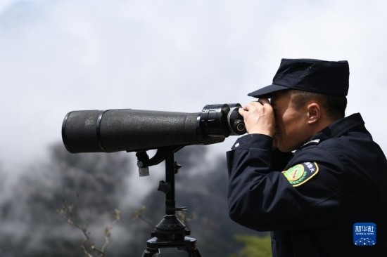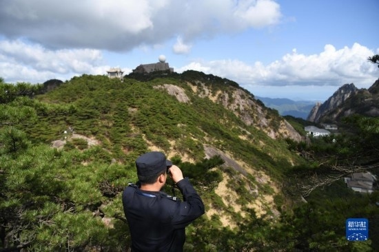 4月20日,在黃山風(fēng)景區(qū),瞭望哨防火小隊(duì)隊(duì)員汪新平在用望遠(yuǎn)鏡觀測(cè)山林。