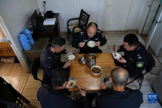 4月20日,在黃山風(fēng)景區(qū)平天矼瞭望哨內(nèi),瞭望哨防火小隊(duì)5名隊(duì)員在吃晚飯,右一為秦志平。
