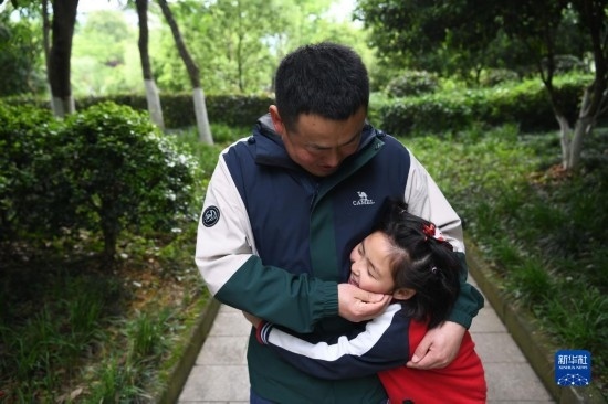 5月7日,在安徽省黃山市黃山區(qū),休假中的秦志平和女兒秦靖妍在自家小區(qū)里交流。