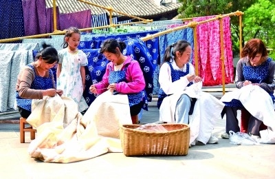 云南巍山縣,幾位民族工藝廠女員工在進(jìn)行非遺扎染產(chǎn)品制作。張樹(shù)祿攝/光明圖片