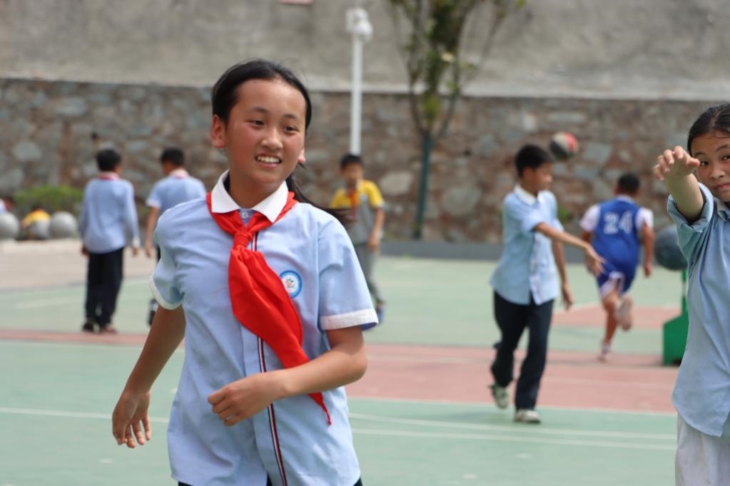 5月30日,貴州省榕江縣古州鎮(zhèn)第四小學(xué)四年級(jí)學(xué)生楊文源(右)在體育課上和同學(xué)一起打籃球。新華社記者 鄭明鴻 攝