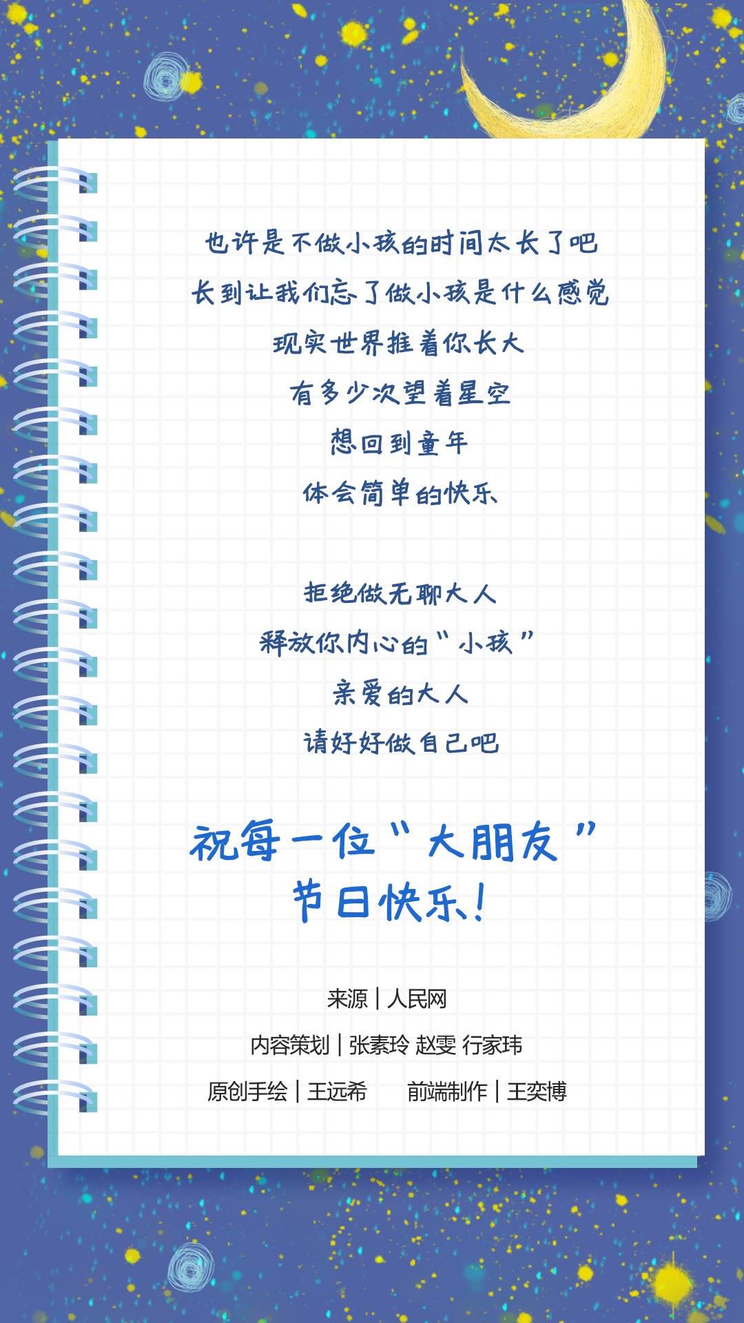 也許是不做小孩的時(shí)間太長(zhǎng)了吧,長(zhǎng)到讓我們忘了做小孩是什么感覺?,F(xiàn)實(shí)世界推著你長(zhǎng)大,有多少次仰望星空,想回到童年,體會(huì)簡(jiǎn)單的快樂。拒絕做無聊大人,釋放內(nèi)心的“小孩”,親愛的大人,請(qǐng)好好做自己吧!祝每一位“大朋友”節(jié)日快樂!