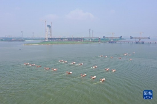 這是6月2日在水域救援實(shí)戰(zhàn)演習(xí)現(xiàn)場拍攝的消防舟艇編隊(duì)(無人機(jī)照片)。