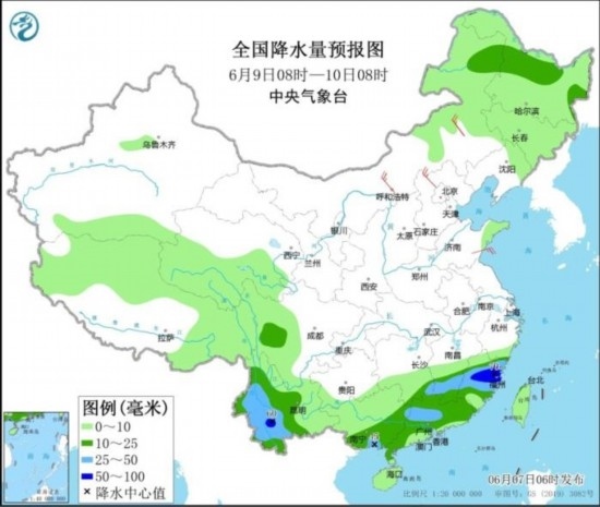 圖3 全國降水量預報圖(6月9日08時-10日08時)