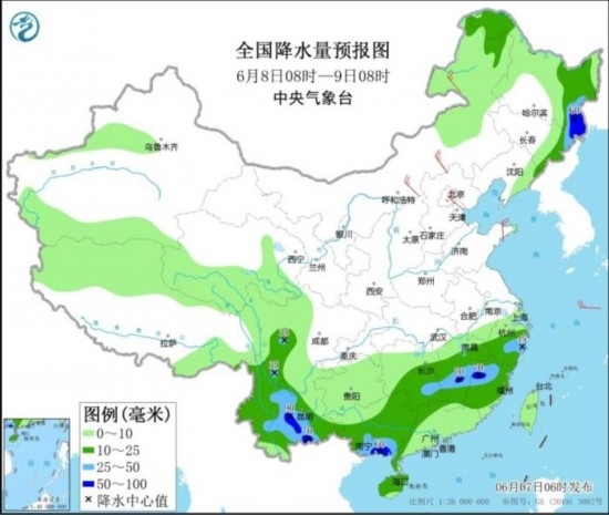 圖1 全國降水量預報圖(6月7日08時-8日08時)