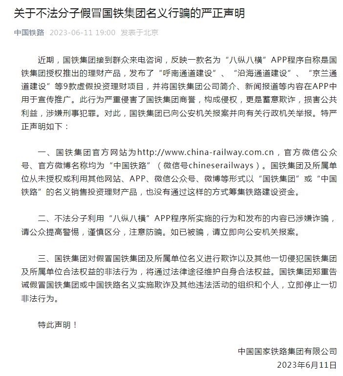 “中國鐵路”微信公眾號(hào)6月11日發(fā)布嚴(yán)正聲明稱,近期,國鐵集團(tuán)接到群眾來電咨詢,反映一款名為“八縱八橫”APP程序自稱是國鐵集團(tuán)授權(quán)推出的理財(cái)產(chǎn)品,發(fā)布了“呼南通道建設(shè)”、“沿海通道建設(shè)”、“京蘭通道建設(shè)”等9款虛假投資理財(cái)項(xiàng)目,并將國鐵集團(tuán)公司簡(jiǎn)介、新聞報(bào)道等內(nèi)容在APP中用于宣傳推廣。