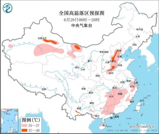 中央氣象臺6月29日06時繼續(xù)發(fā)布高溫黃色預(yù)警:預(yù)計6月29日白天,北京、天津、河北中南部、河南北部、山東西部、湖南東部、江西、浙江中北部、福建北部、廣西西部和東北部、廣東西北部以及內(nèi)蒙古西北部、新疆東部、甘肅河西等地的部分地區(qū)有35~37℃高溫天氣,其中,河北中南部、河南北部、新疆吐魯番盆地等地局地最高氣溫可達(dá)38~39℃(見圖3)。