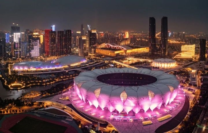 比如充滿想象的場館設(shè)計。錢塘江畔的“大蓮花”,其建筑體態(tài)源于錢塘江水的動態(tài),給人以震撼的同時,也“盛放”出浙江的文化底蘊和藝術(shù)魅力;“水?!杯h(huán)繞的手球館,外觀別具一格,“條條水?!贝孤浜苁俏?;以“杭州傘”為造型的曲棍球場,則詮釋出江南古典美學(xué)十足的浪漫韻味。