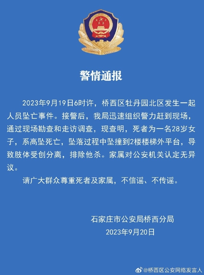 ·石家莊橋西區(qū)發(fā)生人員墜亡事件,警方:系高墜死亡,排除他殺。