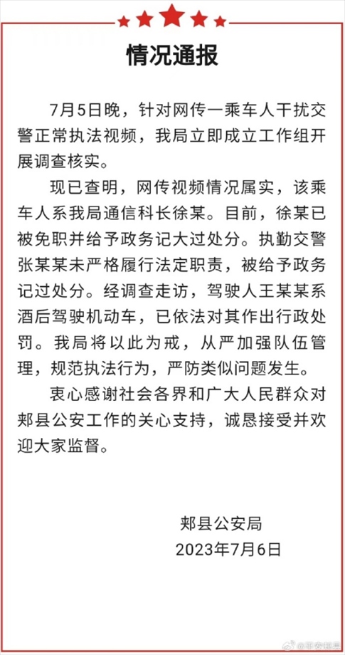 ·平頂山郟縣警方通報“男子掏警官證讓交警放行”:涉事人被免職。