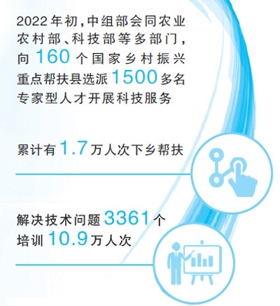 2022年初,中組部會同農業(yè)農村部、科技部等多部門,以“一縣一團”方式,向160個國家鄉(xiāng)村振興重點幫扶縣選派1500多名專家型科技支撐人才,精準開展科技服務和人才培養(yǎng)幫帶。