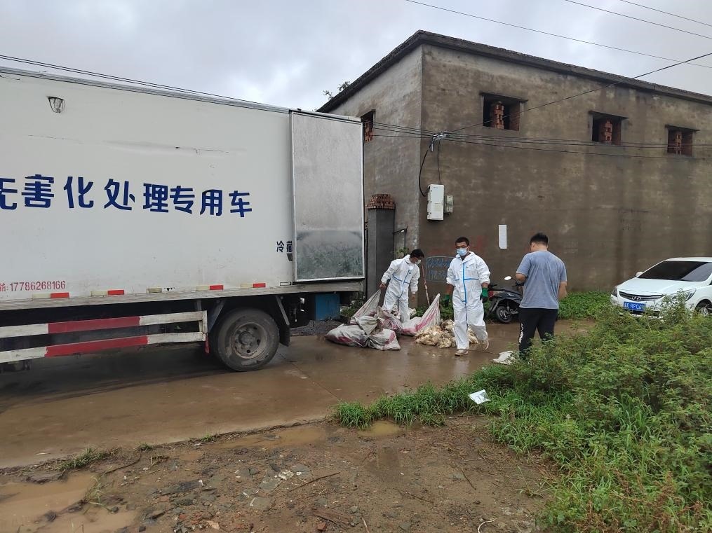 河北省雞澤縣一家蛋雞養(yǎng)殖場門口,專業(yè)人員對養(yǎng)殖場內(nèi)淹死的蛋雞進行集中收集裝車。(雞澤縣農(nóng)業(yè)農(nóng)村局供圖)