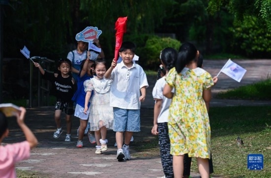 8月24日,在湖州市龍泉街道白魚(yú)潭社區(qū),孩子們拿著自己制作的火炬,參與趣味火炬?zhèn)鬟f活動(dòng)。