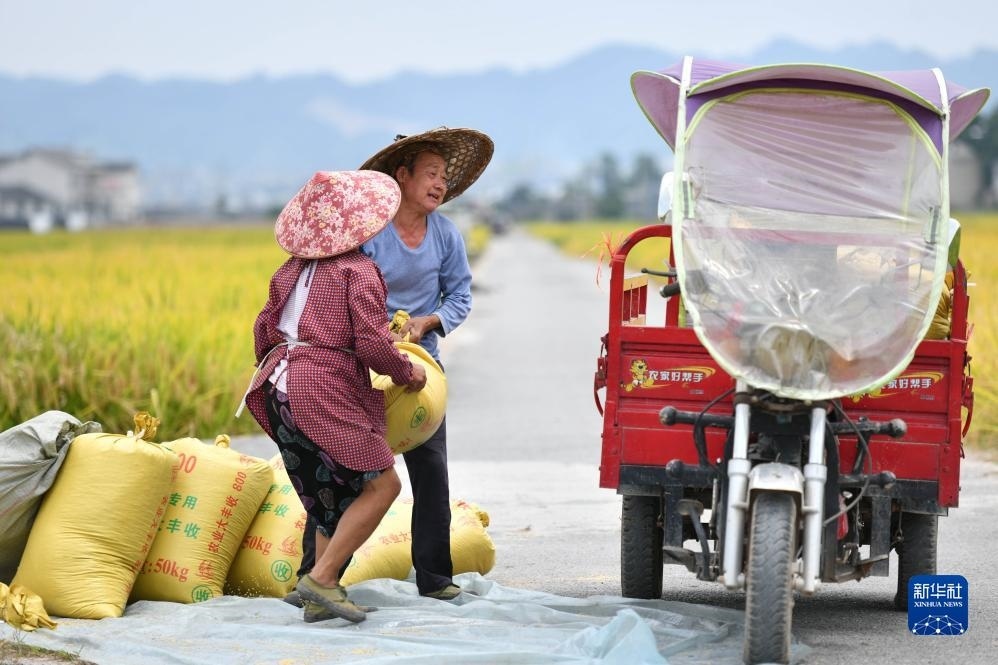 9月6日,村民在貴州省黔東南苗族侗族自治州黃平縣舊州鎮(zhèn)萬(wàn)畝大壩搬運(yùn)剛收獲的稻谷。