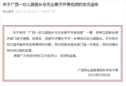 ·廣西鐘山縣通報幼兒園園長與男子開房視頻:系某民辦幼兒園園長,將進(jìn)一步核實(shí)師德師風(fēng)問題。
