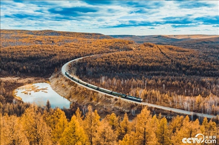 內(nèi)蒙古呼倫貝爾,牙林鐵路上的列車穿行在大興安嶺的金色樹林之中,美如畫卷。