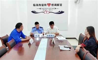 圖④:臨海法院執(zhí)行法官與拘留所民警共同開展調解,促成雙方當事人達成執(zhí)行和解。