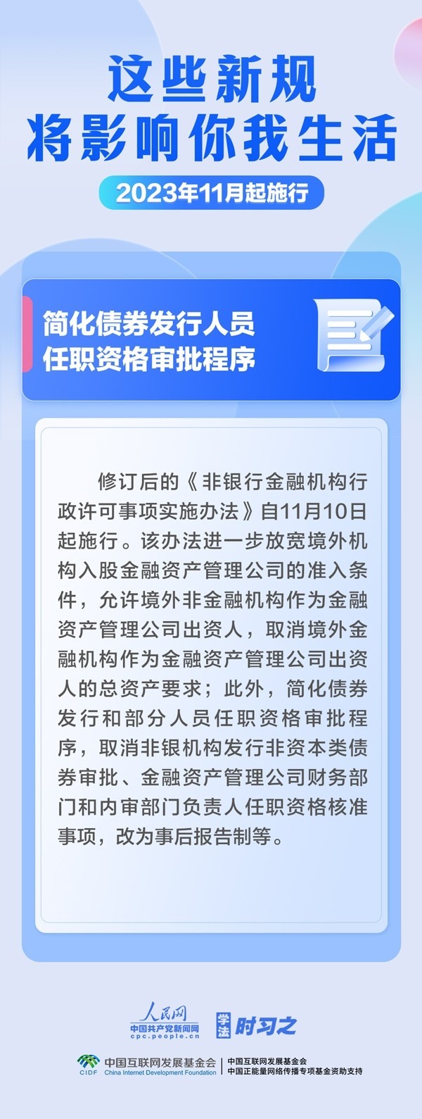調(diào)整最高法知產(chǎn)法庭審理上訴案件范圍;簡化債券發(fā)行人員任職資格審批程序;取消出口貨物原產(chǎn)地企業(yè)備案事項(xiàng)……11月,這些新規(guī)施行,將影響你我生活。