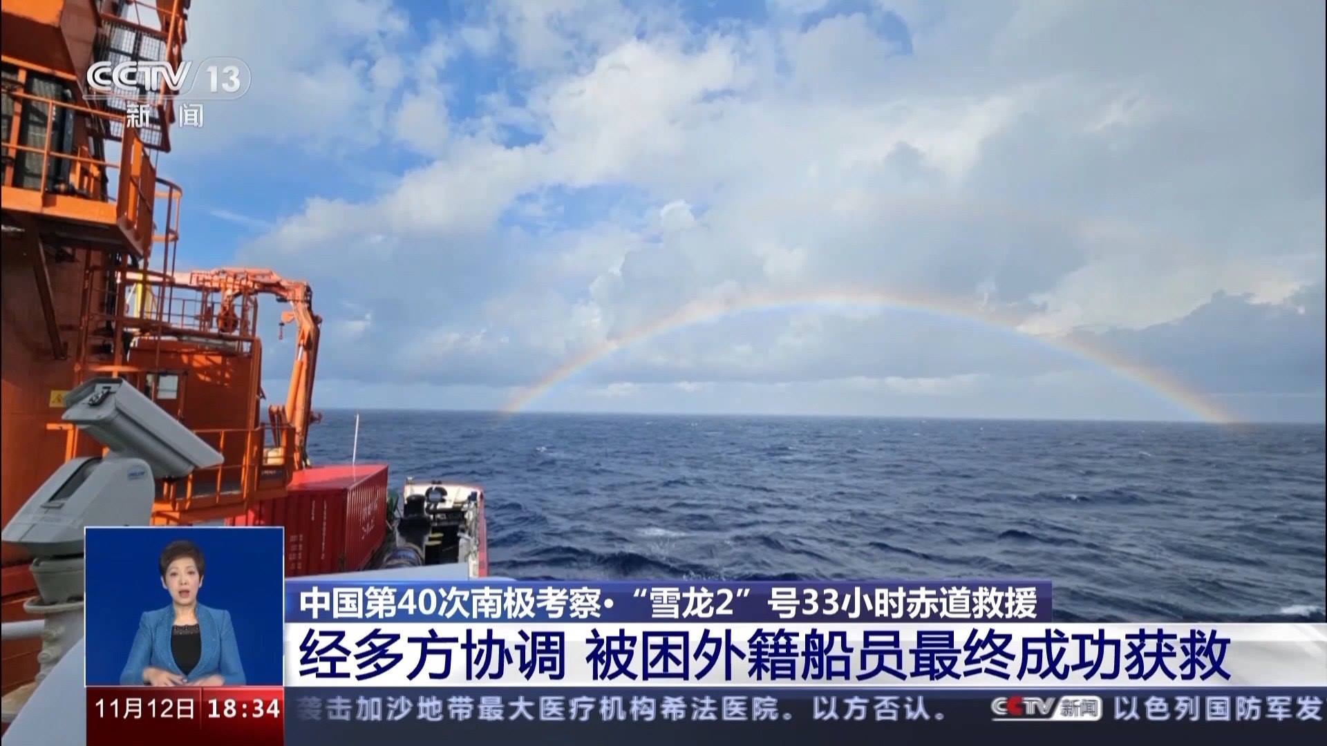 一個小時(shí)后,求救船只安全吊運(yùn)到“雪龍2”號的尾部甲板,此時(shí),原本陰雨的天空放晴,一道彩虹掛在天邊,“雪龍2”號重新起航。