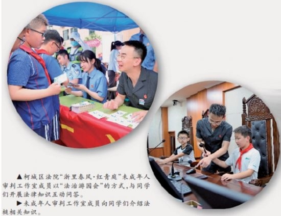 “‘紅青庭’品牌Logo中,‘紅’字既突出黨建統(tǒng)領又寓意紅領巾,是百折不撓的精神象征;‘青’字代表著青少年,是肩負未來的青春力量;‘庭’字則是指少年法庭和家庭?!焙l(wèi)民介紹,柯城區(qū)法院依托“浙里春風·紅青庭”品牌,成立青少年法治教育實踐基地和未成年人審判工作室,積極開展內(nèi)外聯(lián)動,在持續(xù)加強涉未成年人刑事、民事、行政審判融合的基礎上,不斷深化與公安、檢察、教育、團委、婦聯(lián)等部門的協(xié)調(diào)配合,構筑全方位、多鏈條的綜合司法保護機制。