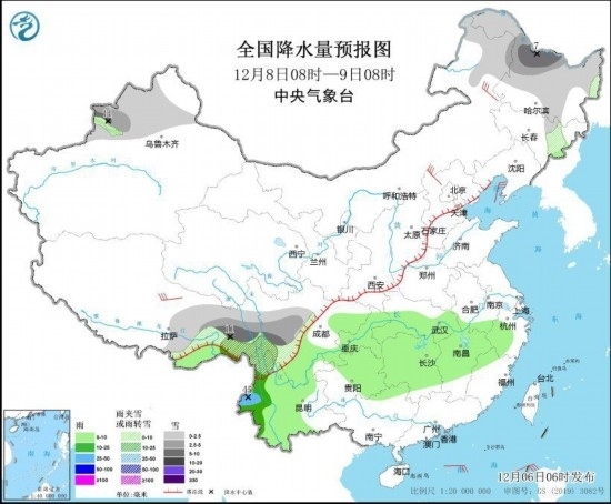 12月8日08時(shí)至9日08時(shí),內(nèi)蒙古東北部、黑龍江大部、吉林中部、新疆北部、西藏東部、川西高原等地部分地區(qū)有小到中雪或雨夾雪,其中,黑龍江北部、新疆伊犁河谷、西藏東部、川西高原南部等地部分地區(qū)有大到暴雪(10~11毫米)。西藏東南部、川西高原南部、云南大部、四川盆地、貴州東北部、湖南、湖北南部、江西中北部、浙江西部、安徽南部等地部分地區(qū)有小到中雨,其中,云南西部局地有大雨(25~45毫米)。內(nèi)蒙古東北部、西藏北部、華北北部等地部分地區(qū)有4~6級(jí)風(fēng)。