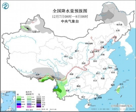 12月7日08時(shí)至8日08時(shí),內(nèi)蒙古東部、黑龍江中西部、新疆北部、西藏東部、川西高原南部、云南西北部等地部分地區(qū)有小到中雪或雨夾雪,其中,新疆伊犁河谷、西藏東南部等地局地有大到暴雪(10~12毫米)。西藏南部、四川南部、云南中西部、臺(tái)灣島等地部分地區(qū)有小到中雨,其中,云南西部局地有大雨(25~45毫米)。內(nèi)蒙古中部、新疆北疆等地部分地區(qū)有4~6級(jí)風(fēng)。